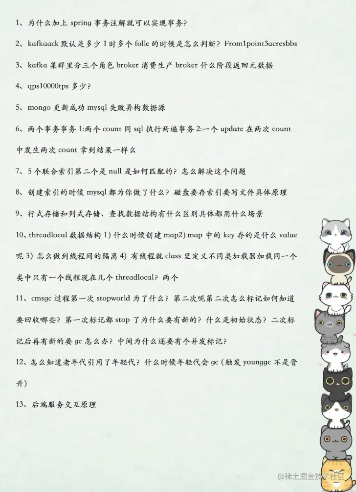 这一顿问题轰炸我——直接人没了(这个是我入职以后跟我的上级重新整理的,多数是会问到的,不是百分百我当时遇到的)我已经忘了我哪个问题回答的怎么样了,就记得我出来的时候有点头重脚轻,还有点眼花。就是中间没有什么太长的思考时间,基本就来了就答,也没有什么其他的沟通,这个面试官在简历里面好像还放了一个面试题的纸,中间还有在做笔记。总之我觉得刷题还是有帮助的,很多的问题可以用真题项目里面的答案来带入,当然基础性的问题还是需要自己知道的。