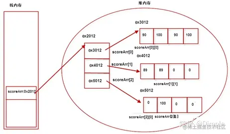 - int [][] scoreArr = new int[5][10] 定义一个一维数组,长度是5,每个元素是一个一维数组
