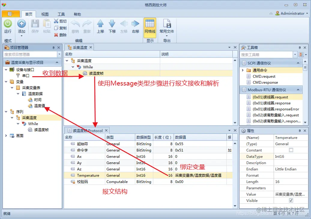 其中Message步骤是报文步骤,可以通过自定义报文结构来编写通信协议,可以自定义任意结构的通信协议,非常方便和设备进行通信。