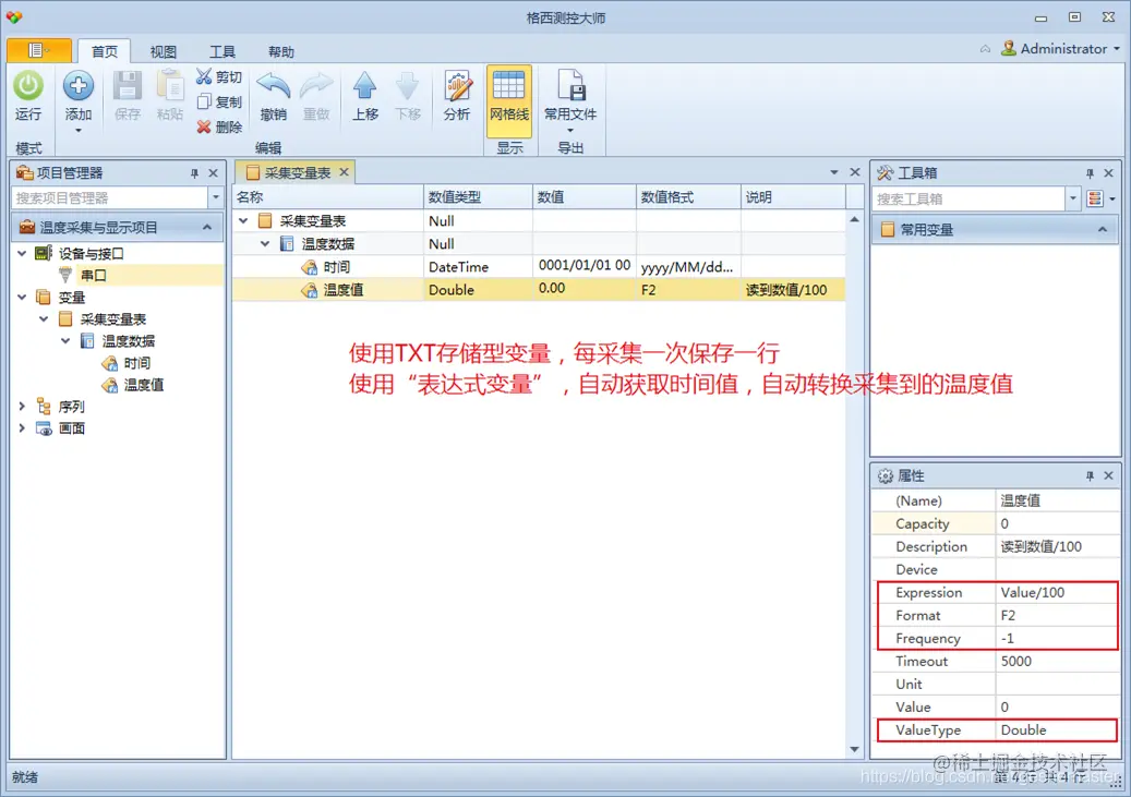 TXT文件类型变量:当其所有子变量都改变过后,形成一条记录,保存到文件中。本例子中的时间数据通过表达式变量自动生成,而温度数据,每次采集完毕后通过数据绑定的方式把采集序列中的温度值分别赋给“温度值”变量,即可生成一条记录。