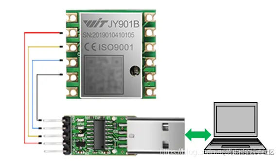 传感器模块串口上位机连接:使用USB-TLL串口模块连接,VCC接VCC,TX接RX,RX接TX,GND接GND。