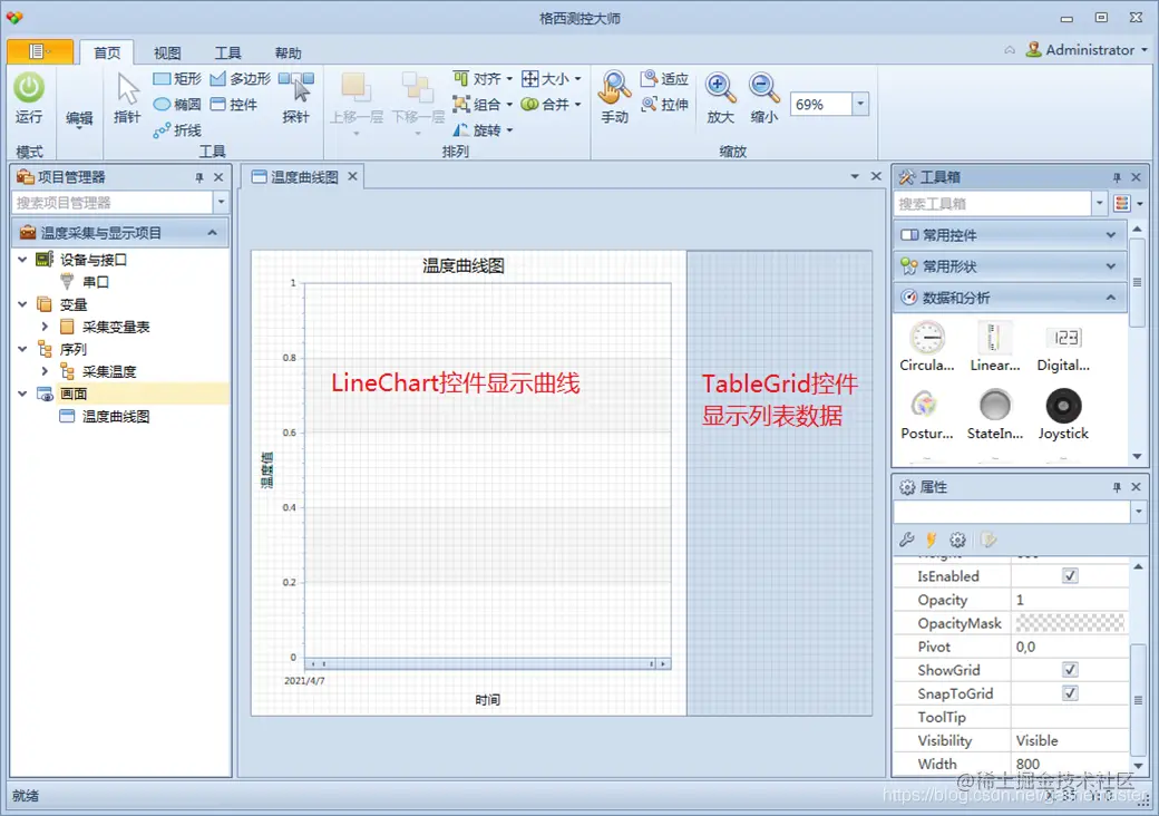 本例子用到的控件:LineChart(曲线图)、TableGrid(数据表)。