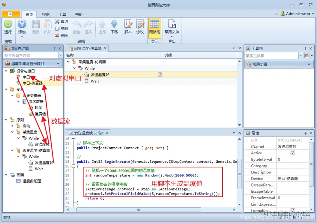 3、编写“发送温度帧”步骤的脚本,生成随机温度值。