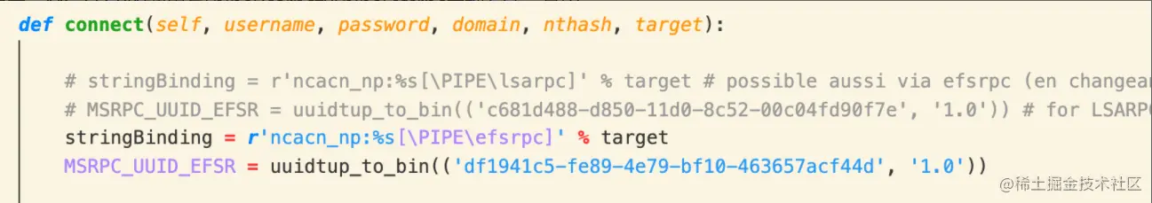 在PetitPotam的Poc里面有一句注释possible aussi via efsrpc (en changeant d'UUID) mais ce named pipe est moins universel et plus rare que lsarpc ;),翻译过来就是