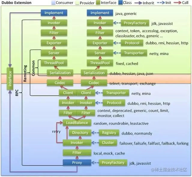 Dubbo框架设计共划分了10层,最上面的Service层是留给实际使用Dubbo开发分布式服务的开发者实现业务逻辑的接口层。图中左边淡蓝背景的为服务消费方使用的接口,右边淡绿色背景的为服务提供方使用的接口,位于中轴线上的为双方都用到的接口。