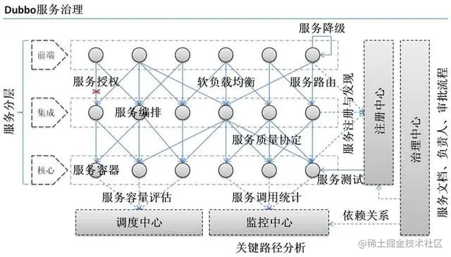 当服务越来越多,容量的评估,小服务资源的浪费等问题逐渐显现,此时需增加一个调度中心基于访问压力实时管理集群容量,提高集群利用率。此时,用于提高机器利用率的 资源调度和治理中心(SOA) 是关键。