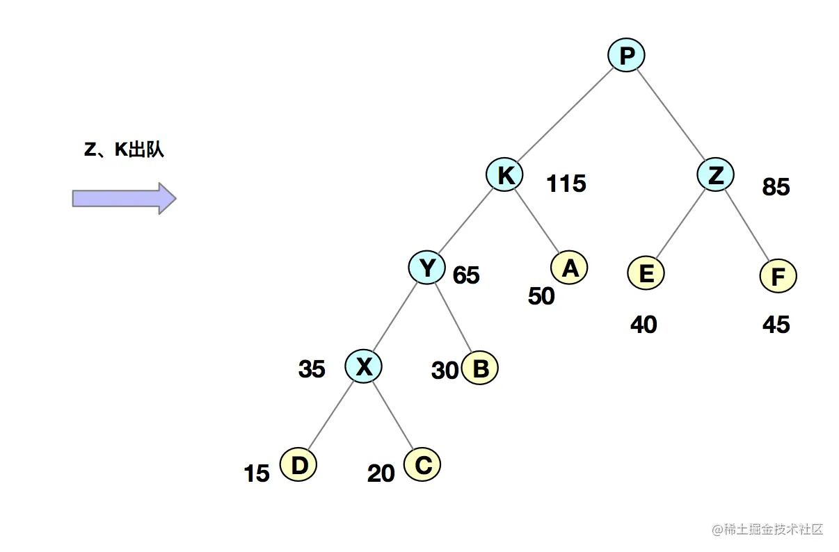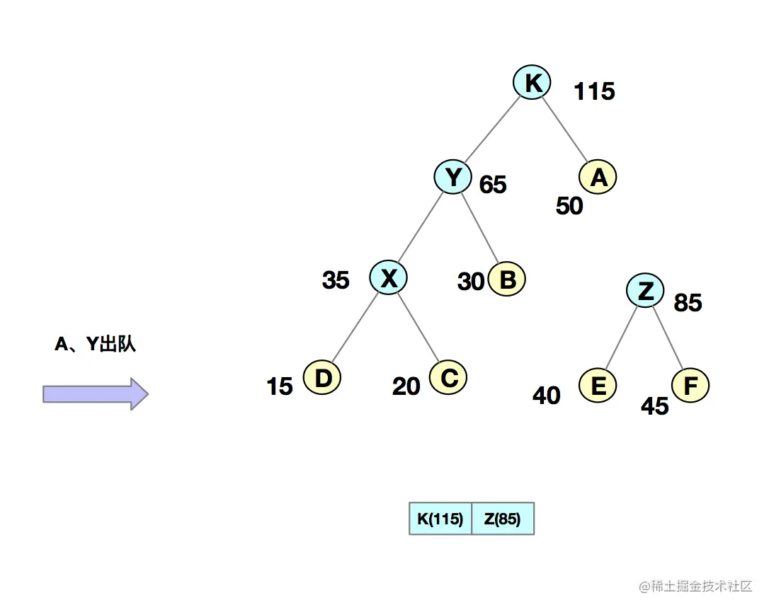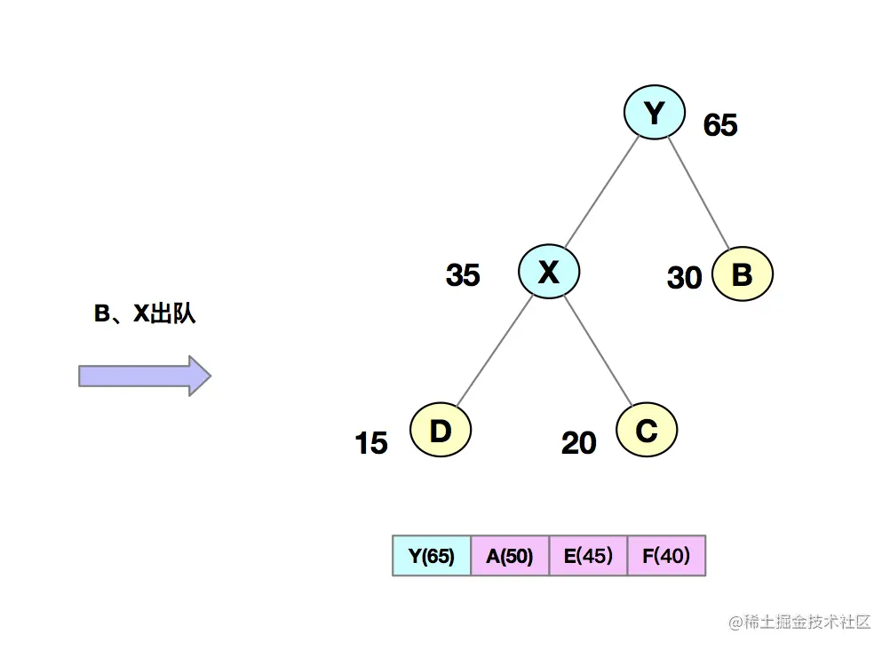 我们把每个字符当作一个节点,并且把他们插入到优先级队列中(按照频率由小到大来排序)。然后我们从队列中取出频率最小的两个节点 A、B,然后新建一个节点 X,把频率设置为两个节点的频率之和,并把这个新节点 X 作为节点 A、B 的父节点。最后再把 X 节点放入到优先级队列中。重复这个过程,直到队列中没有数据。如下图所示: