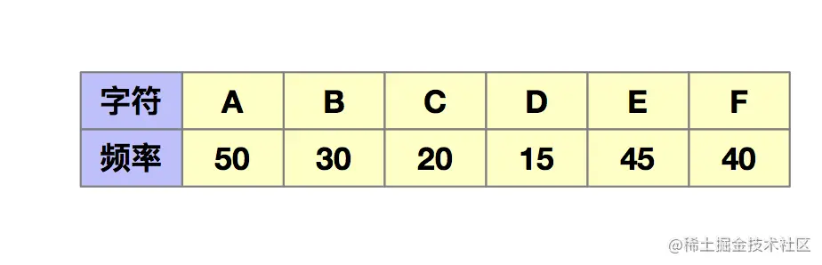下面我们来具体看一下哈夫曼编码的编码过程。首先我们假设这6个字符出现的频率如下图所示: