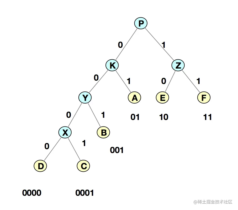 然后,我们给每一条边加上一个权值,指向左子节点的边记为 0,指向右子节点的边,标记为 1,那从根节点到叶节点的路径就是叶节点对应字符的哈夫曼编码。