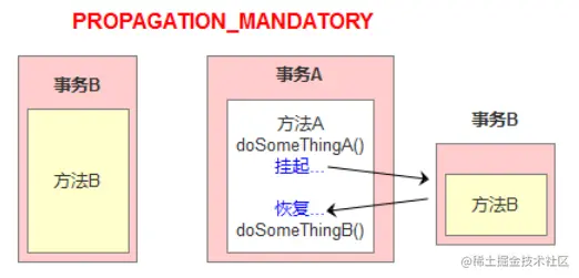 当调用 methodA 时,开启了 事务 A。执行到 methodB 时,开启一个事务B,此时事务 A 挂起,当事务 B 执行完成后,继续执行事务 A 。