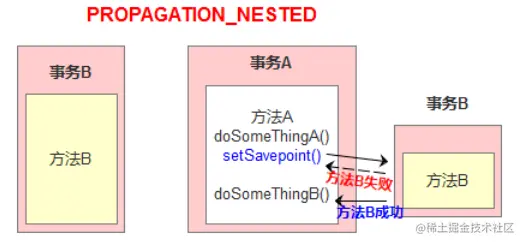 - 当执行 methodA 时,开启事务 A,执行到 methodB,开启内层事务 B。