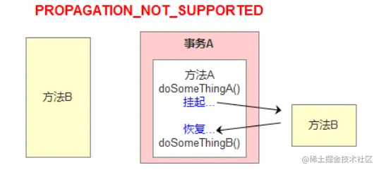 - 当调用 methodA 时,开启 事务 A。当执行到 methodB 时,挂起事务A,以非事务的方式执行 methodB 。