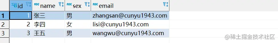 (1, '张三', '男', 'zhangsan@cunyu1943.com'),
