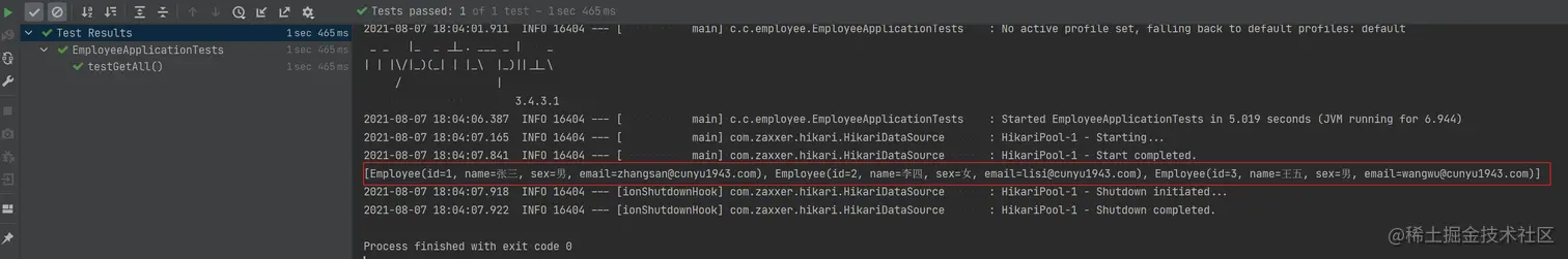 这里需要注意的是 Assert.assertEquals(3, employees.size()); 这句代码,这里我们引入了 Junit 测试模块,所以需要记得在 pom.xml 中添加相关依赖,更多关于 Junit 测试相关的信息,可以参考我之前写的一篇文章:抛弃传统注释测试,拥抱 Junit 单元测试。