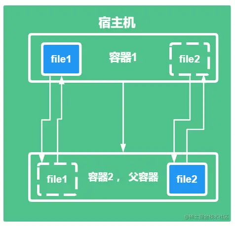 容器间同步数据的原理是通过拷贝的方式,例如在 docker2 上面的挂载上创建了一个文件2,这个时候 docker1 挂载了 docker2,也就是说 docker2 是父容器,那么 docker1 就会将文件2 拷贝到自己对应的挂载中
