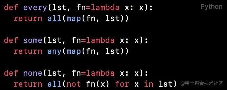 本篇阅读的三份代码的功能分别是判断列表中的元素是否都符合给定的条件;判断列表中是否存在符合给定的条件的元素;以及判断列表中的元素是否都不符合给定的条件。