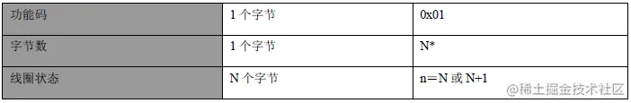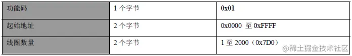 下面以“01 (0x01)读线圈”为例描述功能码,详细的描述请参考Modbus协议。