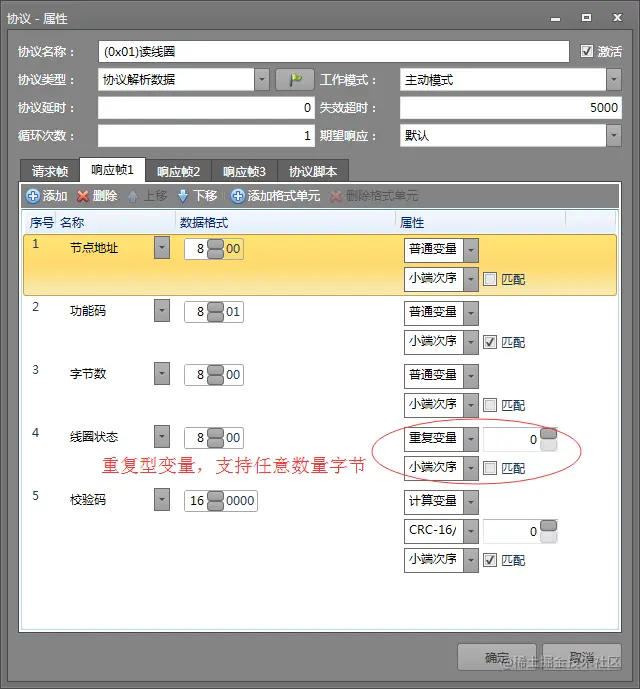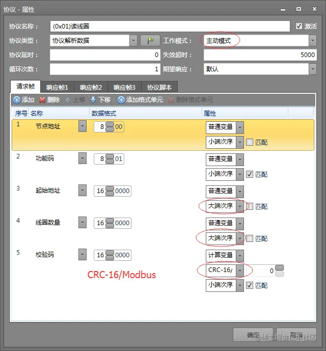 下面以“(0x01)读线圈”命令为例说明协议项编制方法。