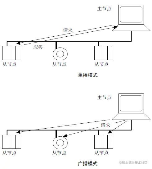 主节点以两种模式对子节点发出Modbus请求。