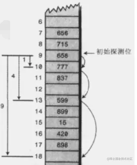 线性探测: 它沿着数组下标一步一步顺序的查找空白单元。