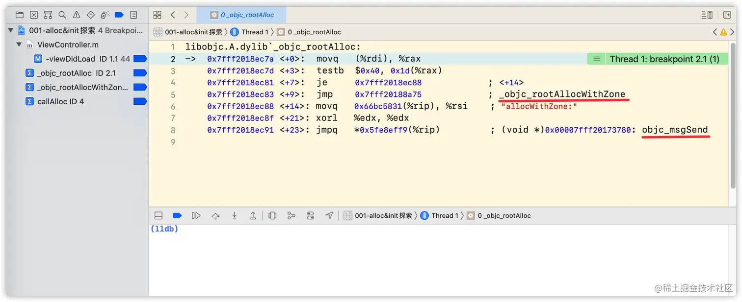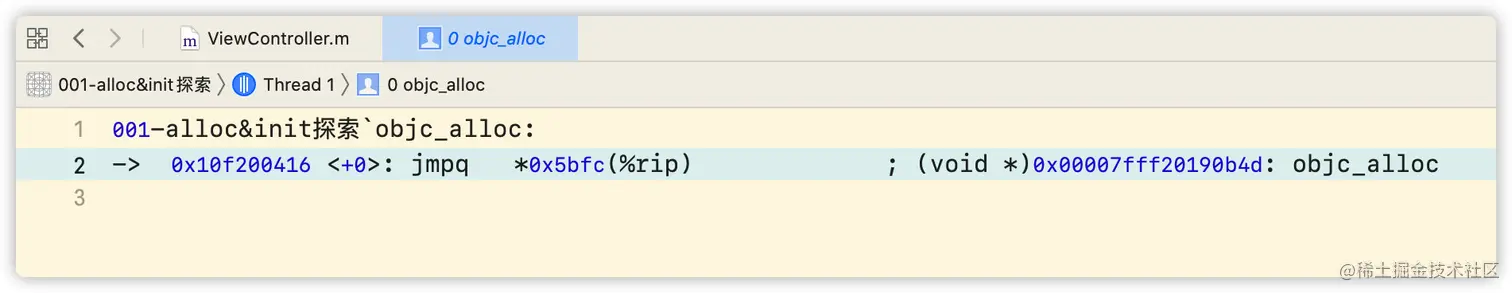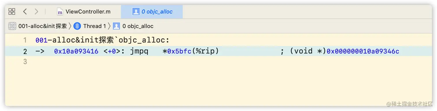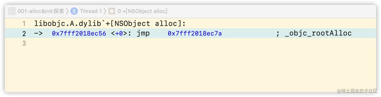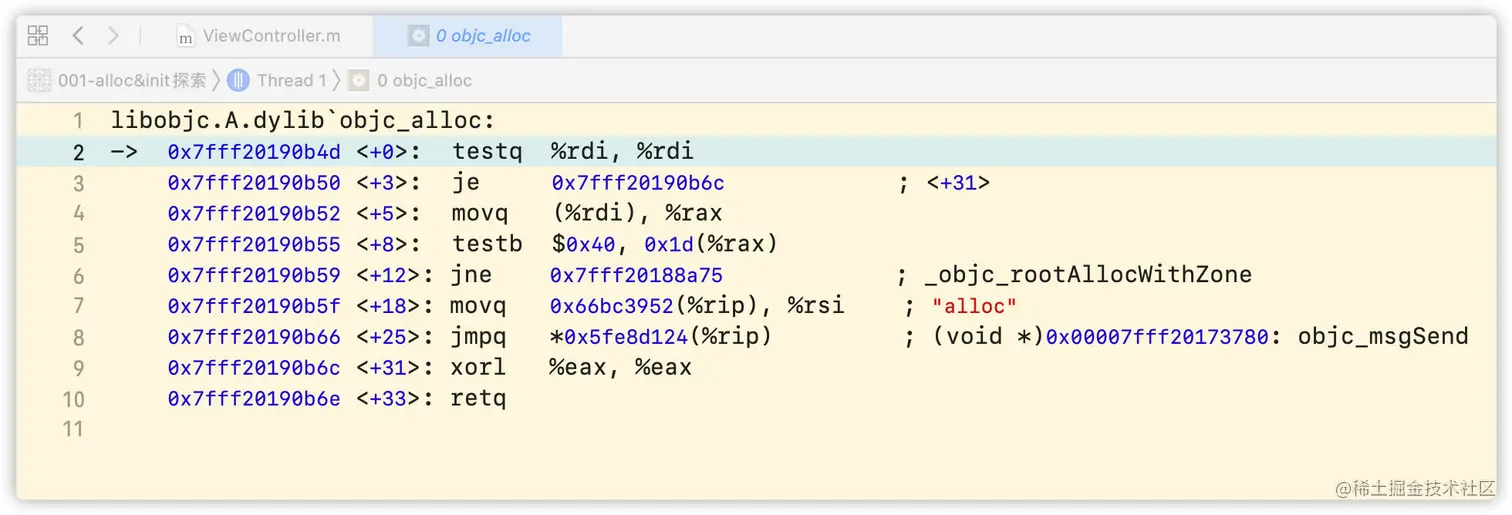 查看汇编方式:选中菜单Debug -> Debug Workflow -> Always Show Disassembly。即可看到汇编代码,按住control键点击step into即可一步一步往下走,最终也会进入到objc_alloc。