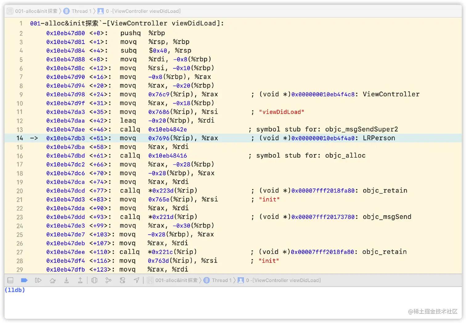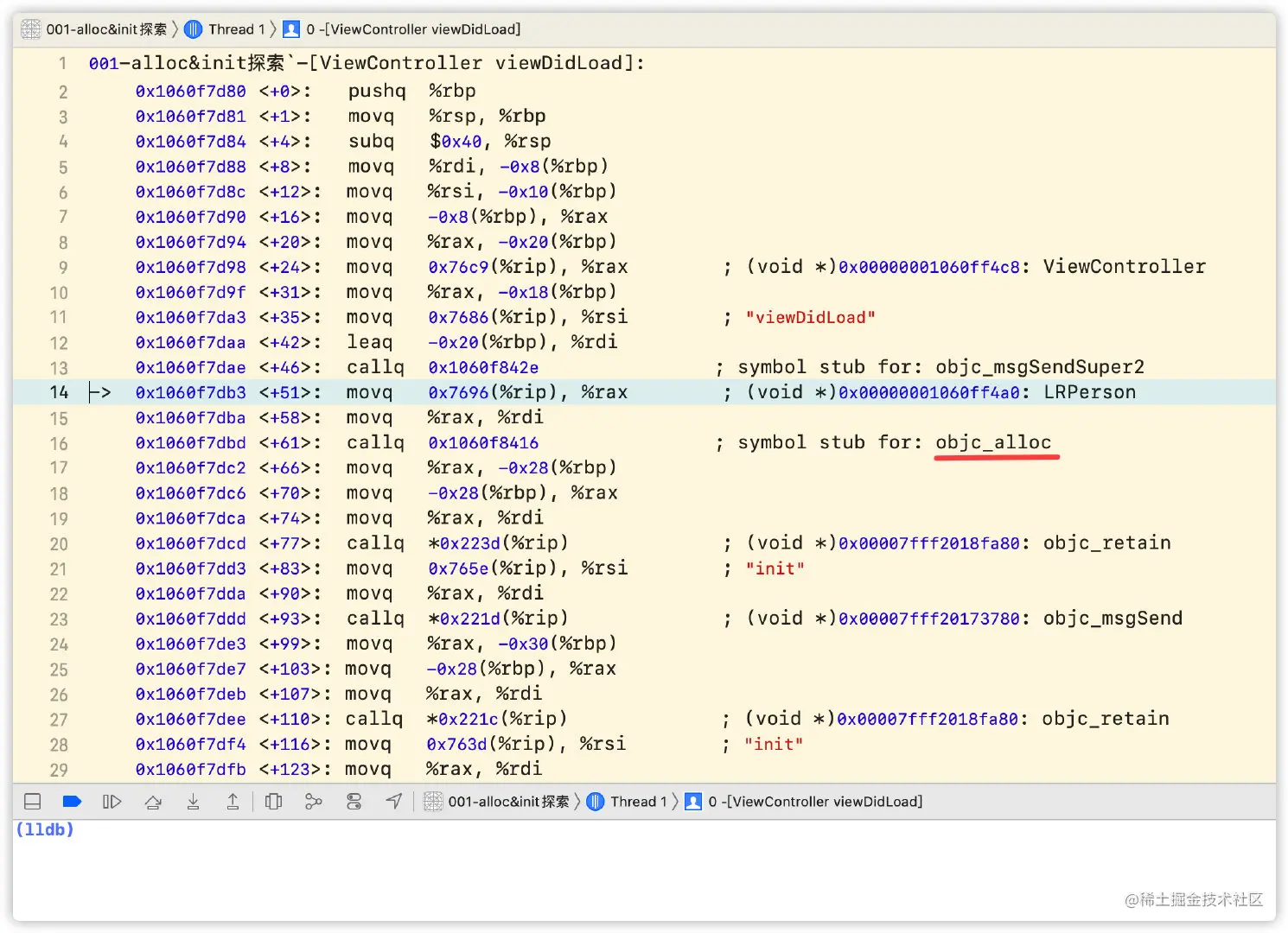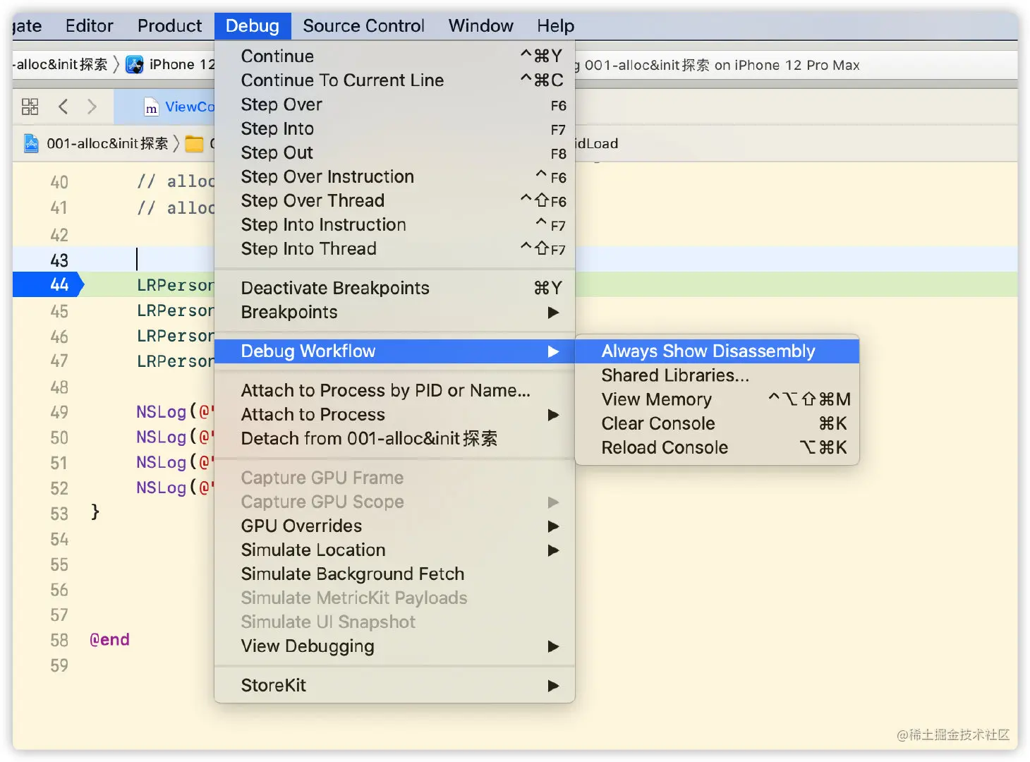 查看汇编方式:选中菜单Debug -> Debug Workflow -> Always Show Disassembly。即可看到汇编代码,按住control键点击step into即可一步一步往下走,最终也会进入到objc_alloc。