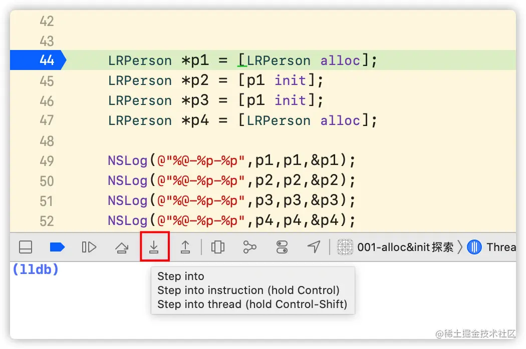 在alloc处添加断点,运行程序停在断点处时,按住control键点击step into,进入下一步,可以看到调用了objc_alloc方法。
