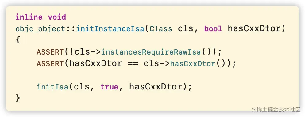 前面两部计算内存大小开辟内存空间后obj只是一个内存地址,还没和相应的类进行关联。initInstanceIsa方法将初始化指针,关联到相应的类。