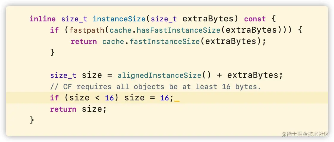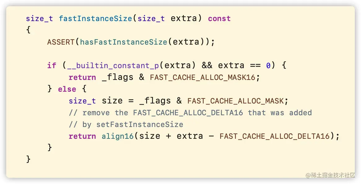 有缓存则走fastInstanceSize方法,最终内存大小通过align16()进行16字节对齐