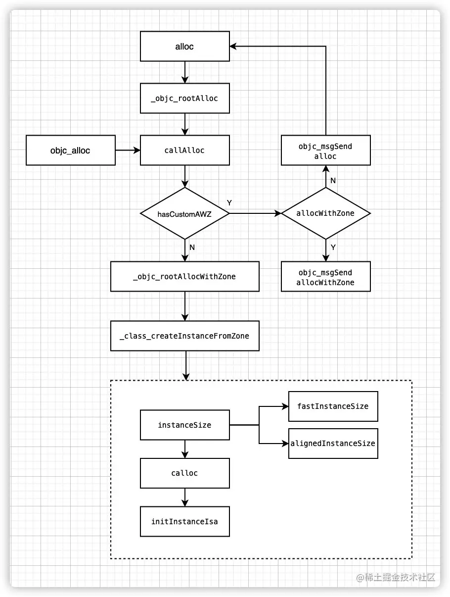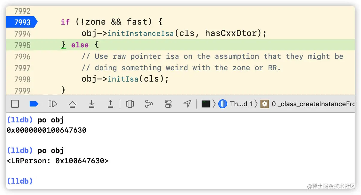 size = cls->instanceSize(extraBytes);先计算出需要的内存空间大小obj = (id)calloc(1, size);向系统申请开辟内存空间,返回地址指针obj->initInstanceIsa(cls, hasCxxDtor);初始化指针,关联到相应的类
