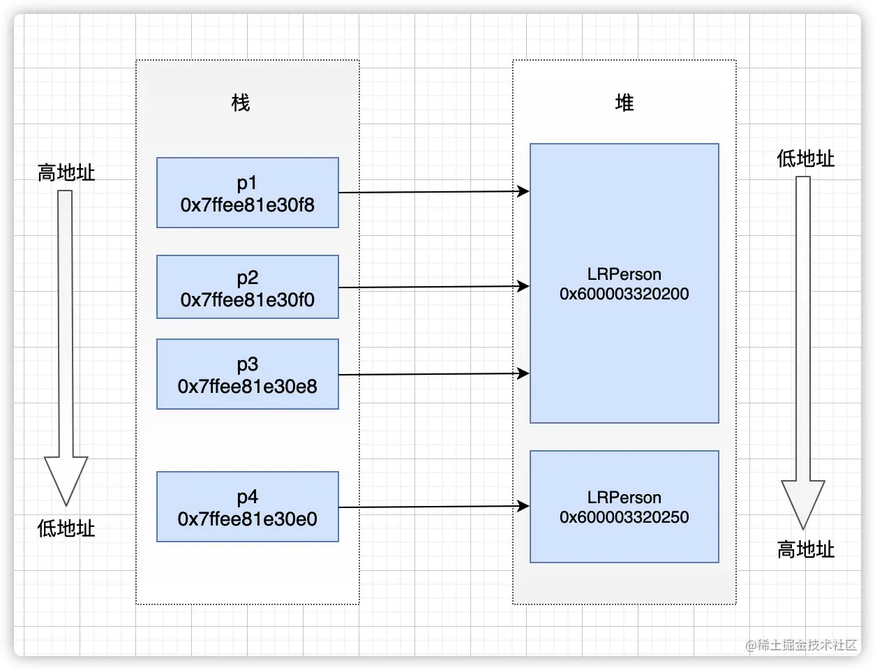 - p1到p4的对象地址是从低地址到高地址,指针地址是从高地址到低地址
