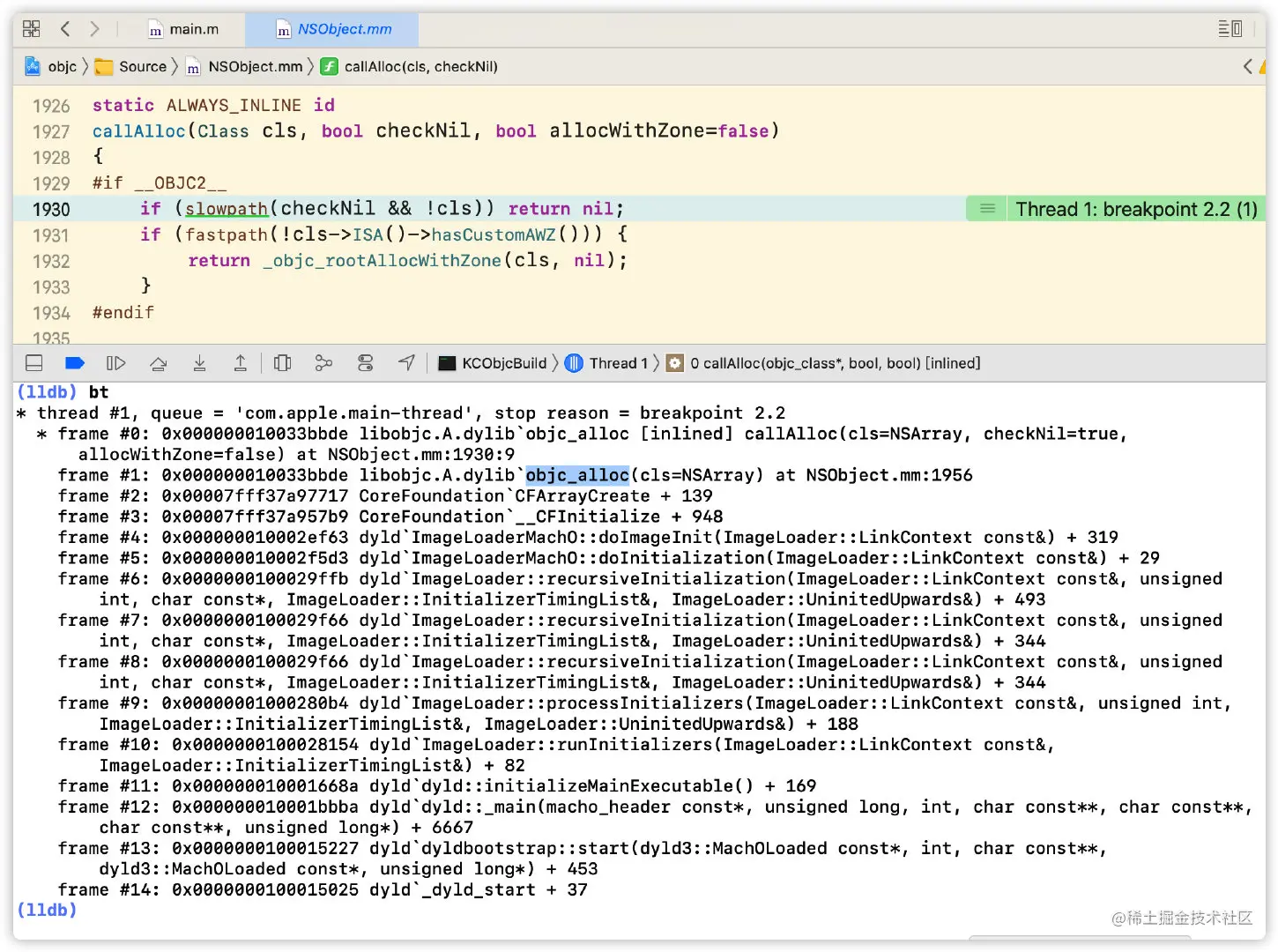 此时我们下个callAlloc符号断点,并运行源码,断住后bt查看堆栈信息,这里发现callAlloc是由objc_alloc进来的,结合上面我们讨论探索底层方法时通过断点和汇编可以发现alloc->objc_alloc->callAlloc。为什么和这里源码一步步点进去分析的流程不一致呢?我们后续再展开讨论。