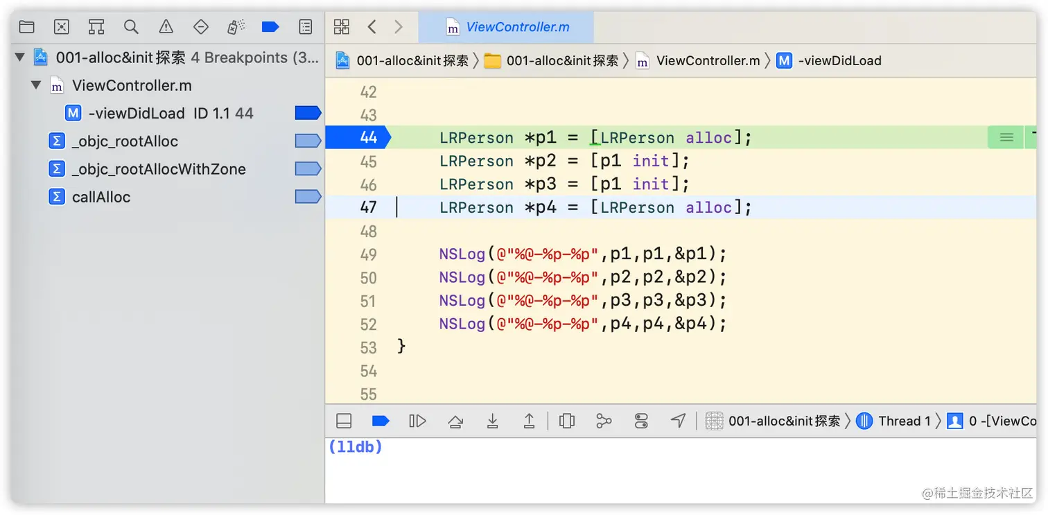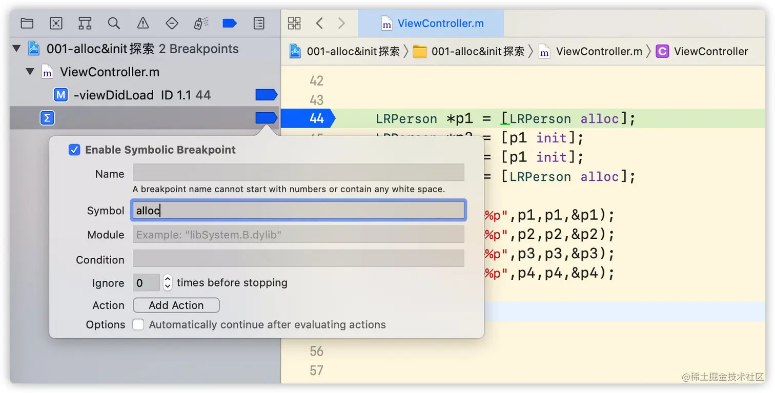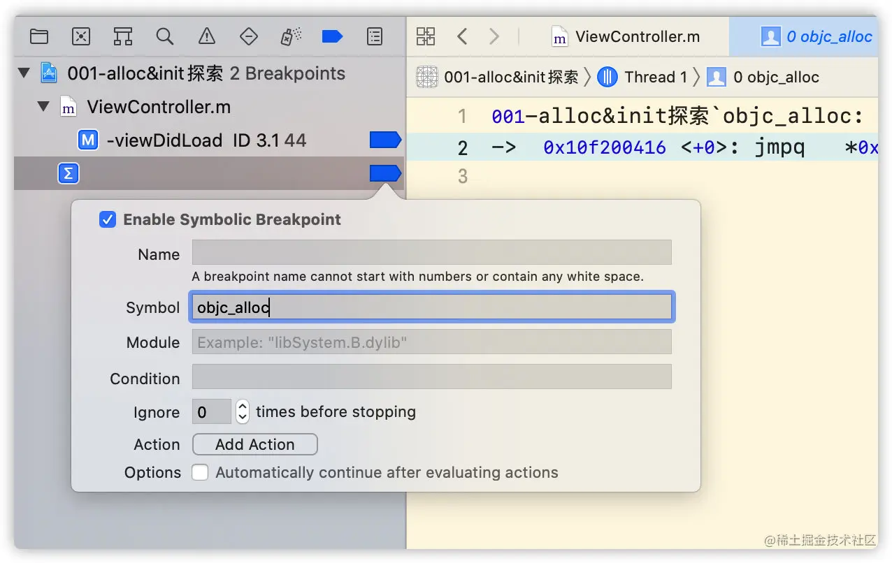 例如我们正在探索alloc方法,在程序断住后直接添加alloc的符号断点