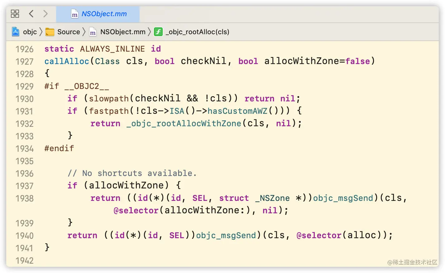 跟着源码一步步点进去alloc->_objc_rootAlloc->callAlloc,会来到callAlloc方法