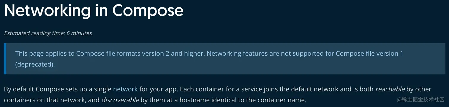 虽然每个容器都在我们主机 127.0.0.1 网络里,但是容器之间是需要通过对方的 IP 地址来交流和访问的,按照官网的介绍 通过 Container Name 就可得知对方容器的 IP。