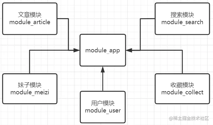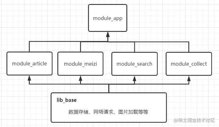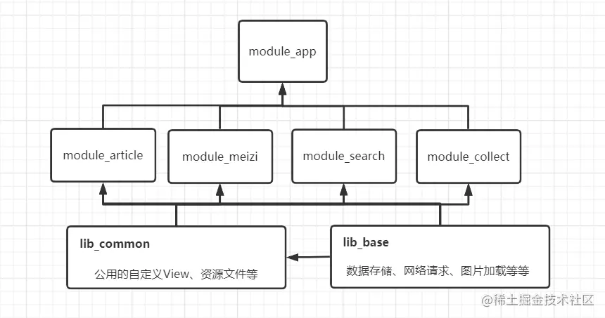 如果一些自定义view,布局文件或者资源文件等会被多个模块使用,那么应该将它们从中剥离出来。但是如果将它们放到module_base中会破坏基础层的通用性,所以需要一个公共层module_common来专门提供上层业务模块的公共资源,同时也保证了基础层代码的通用性,不管放到哪个项目里面都可以正常运行。