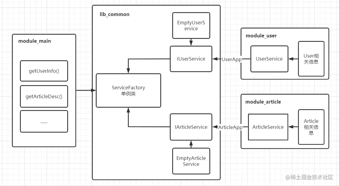 在这个图中lib_common起着桥梁的作用,对需要传递数据的模块(如module_user和module_article)提供相应的接口和空接口实现(实现空接口是为了防止在对应的模块未实现该接口时不会产生运行错误,而是返回默认的数据)。在module_user和module_article中分别实现对应的接口,然后在需要获取数据的模块module_main中调用ServiceFactory里相应的方法,来获得数据。具体各类的代码实现如下: