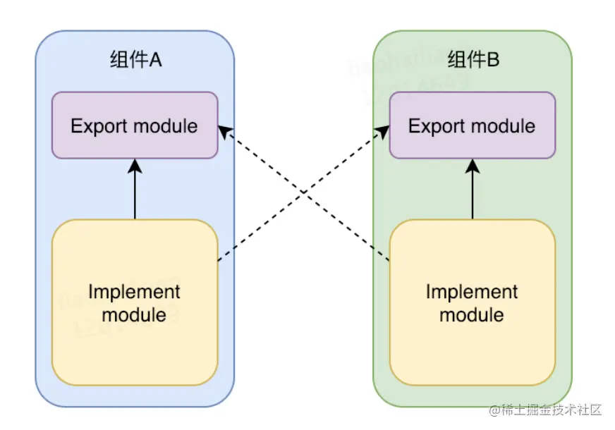 到这里通过下沉接口实现组件间的数据传递的实现就完成了。但是参考美团Android组件化方案,其中对于循环依赖的解决办法是把每个业务组件都拆分成了一个Export Module和Implement Module,其中Export Module复杂对外提供接口,Implement Module负责实现业务逻辑,不对外开发。这样的话如果ModuleA需要使用ModuleB的数据,就只需引入对Module B的Export Module的依赖即可,而不再需要添加对ModuleB的依赖了。ModuleB如果需要使用ModuleA的数据也同理,下面引入美团的一张图来说明: