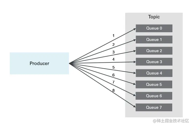 生产者生产的消息虽然是与topic进行绑定,但是在topic上区分了8个队列,消息是按照轮询的方式发送到对应的队列中,比如生产的第一条消息会发送到Queue 0,生产的第二条消息会发送到Queue 1,以此类推,因此可以知道RocketMQ的生产者发送的消息与topic的Queue队列进行绑定时并不是随机绑定,按照轮询的方式与topic上的Queue进行绑定。