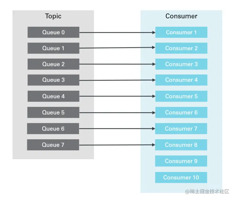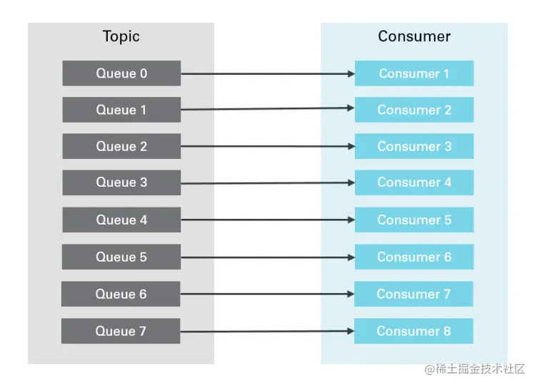 订阅方实例数量等于Queue的数量,每个实例会处理1个Queue上的消息,如图: