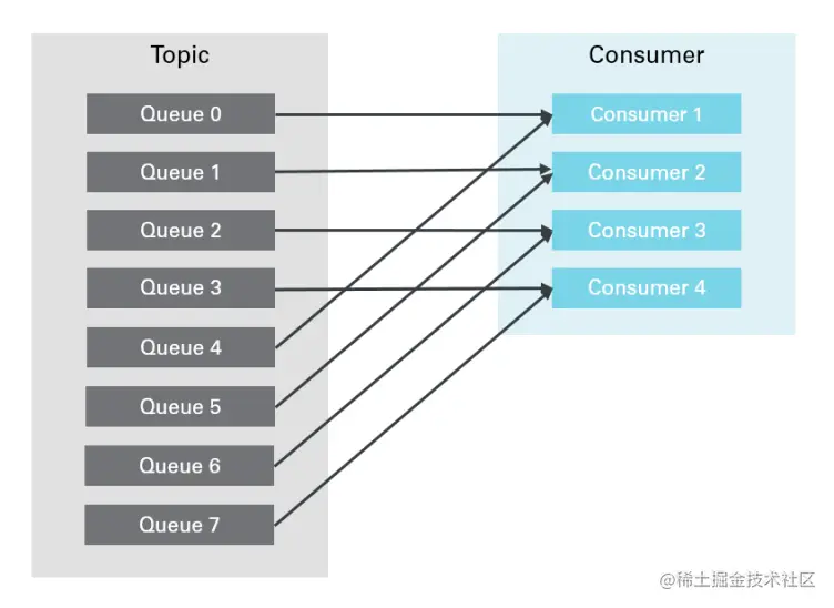 订阅方数量小于Queue的数量,则每台机器会处理多个Queue上的消息,如图: