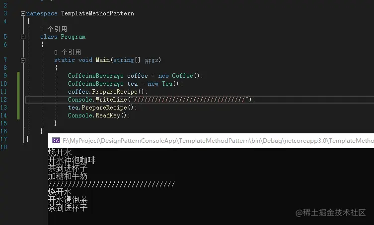 咖啡和茶自己特有的方法,放在自己的类中,每个子类都覆盖PrepareRecipe()方法,并实现自己的冲泡。