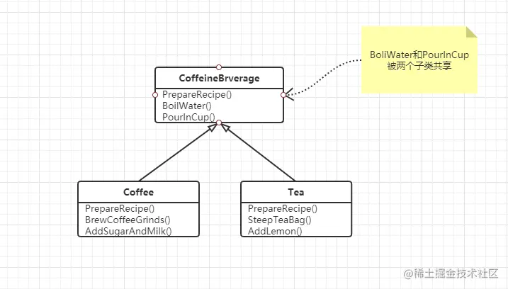 我们从这两个类发现了一些重复的代码,有重复的代码表示我们需要理一下我们的实现方式或者设计。咖啡和茶的代码在第1步和第3步的方法都是一样,其他两个方法是各自独有的,那我们可以将相同的方法抽象到同一个基类中。可能类似如下方式