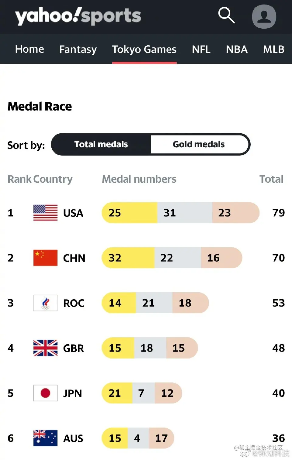 另外前几日中国在金牌榜位居第一时,一张来自yahoo体育的奖牌榜真是让我大为震惊