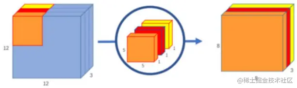 **深度卷积:**每个5×5×1的卷积核对应输入图像中的一个通道,得到三个8×8×1的输出, 拼接后得到8×8×3的结果
