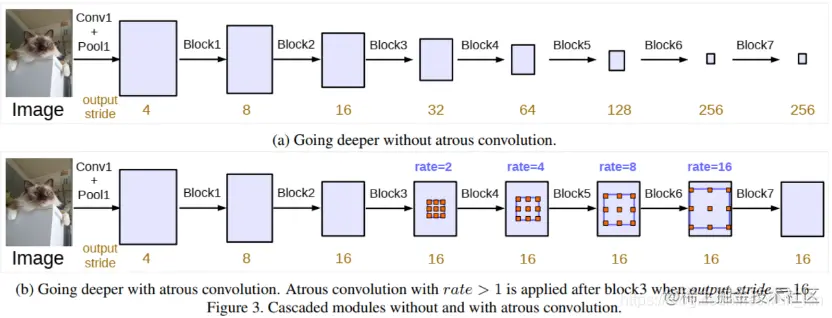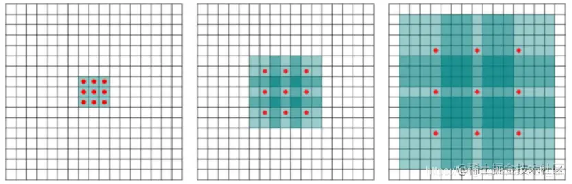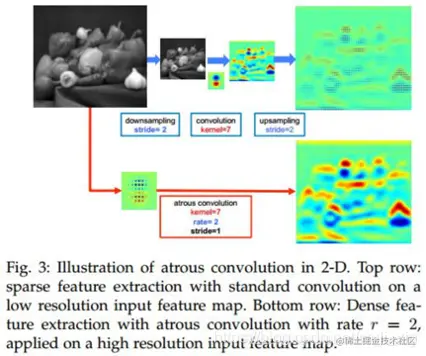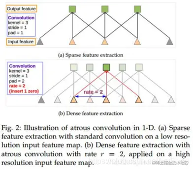标准3×3卷积(rate为1),感受野为3;空洞卷积(rate为2),卷积核尺寸为5x5,感受野为7;空洞卷积(rate为4),卷积核尺寸为9x9,感受野为15。
