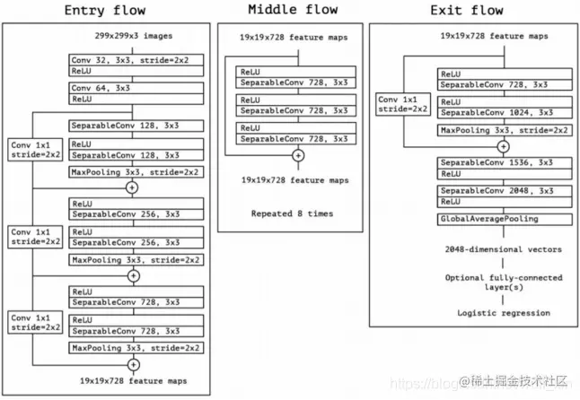 2.所有max pooling结构被stride=2的深度可分离卷积替代。