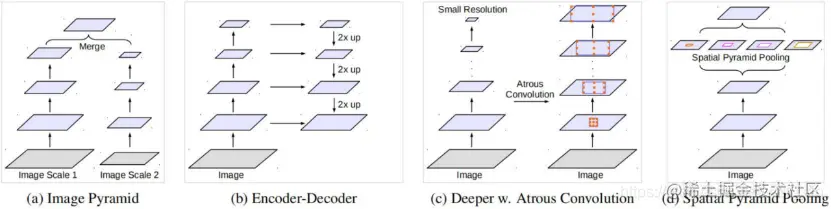 语义分割常用特征提取框架 1.图像金字塔:从输入图像入手,将不同尺度的图像分别送入网络进行特征提取,后期再融合。 2.编解码结构:编码器部分利用下采样进行特征提取,解码器部分利用上采样还原特征图尺寸。 3.深度网络vs空洞卷积:经典分类算法利用连续下采样提取特征,而空洞卷积是利用不同的采样率。 4.空间金字塔结构:除ASPP外,仍有其他网络使用了该思想,如SPPNet、PSPNet等。