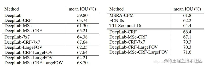 网络变形: DeepLab-MSc:类似FCN,加入特征融合 DeepLab-7×7:替换全连接的卷积核大小为7× 7 DeepLab-4×4:替换全连接的卷积核大小为4× 4 DeepLab-LargeFOV:替换全连接的卷积核大小为3×3,空洞率为12
